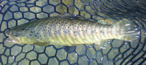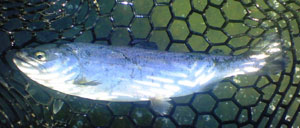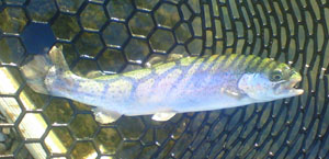 さて話を戻しましょう。BTポンドで釣りを始めて数分してすぐにアタリがありました。すぐにアワせると、ガッチリフッキング!BTポンド一本目はサクラマスでした!このあとはリアクションに反応があることがわかりましたので、K-1ミノー50SPで次々とキャッチ。ブラウントラウトも釣りあげて、正午までに20本超えです♪くろます的にはオッケーですねっ。