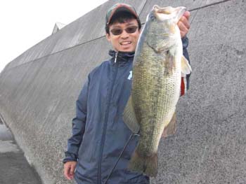 ミーティングを終えて6時30分、選手は思い思いの場所へ向かいました。すると1時間も経たないうちにエーイチ君が風裏となる碧南市民病院裏のアシの前を狙い、レイン フラBホグ(カラーはオーカー系)の1/8ozテキサスリグで40cmをキャッチ。おめでとうございます!!