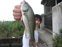 そして8時30分、祥君が見合橋付近で、フリックシェイク4.8(カラーは日焼けメロン)を使用し39cmをキャッチ。祥君は最初別のエリアでトップウォーターを使用して狙っていましたが、バスのバイトがなく沈黙が続きました。疑問をもったまま見合橋の碧南市側にある矢板沿いを同じように狙うもやはり不発。そこでバスが水面まで出てこないのであれば、少しルアーを沈めたほうが良いのではないか?と思い、フリックシェイク4.8のジグヘッドワッキー(シンカーは1.3g)で矢板沿いをリーリングすると、トップにまでは出てこないバスを見事バイトに持ち込むことに成功しました。おめでとうございます!!