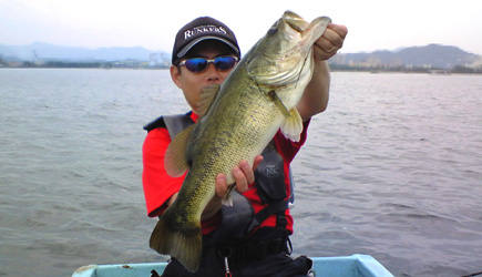 そこでこの場所もあきらめて、さらに南下。ここも同じような場所ですが、お助けポイントとのことで、もう一度ヘビテキにチェンジ。すると数投目でバイト!デカイです!でもラインは30ポンドなので結構簡単にランディングに成功。もちろんgucchi君に手伝っていただきましたけど(笑) 計ってみると55cm。自己記録の58cmには届きませんでしたが、ひさしぶりの琵琶湖でこのサイズならオッケーでしょ!いやあいい釣りできました!