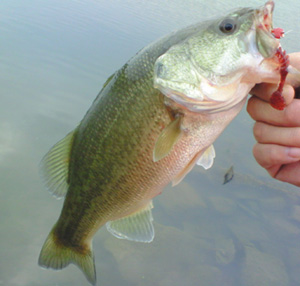 次に移動したのはぬいぐるみワンド。ここではまずスピナーベイトでチェックを入れるもノーバイト。次にクランキングでリーリングスピードに工夫しながら狙うも、こちらもノーバイト。そこで満を持してトレンブルシャッドをキャスト。すると数投目、ウイードの絡むポイントを通過した際にバイト!釣り上がったのは32cmのバスでした!