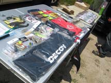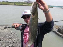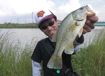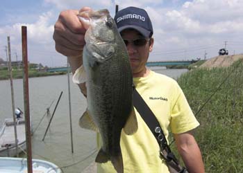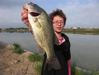 まず4位は、とみぞ〜さんで33.5cm。11時頃、とみぞ〜さんは見合橋の船着き場で頻繁に小刻みなブルーギルのアタリを感じていました。そこでルアーを回収しCCラウンドに装着していたデスアダー6インチのテールを、バイスクロー2.5インチ(カラーはグリーンパンプキン)に変更しボリュームアップさせてキャストしなおすと、今度は強烈なアタリがあり、フッキングして釣り上がったのは33.5cmのバスでした。とみぞ〜さん、おめでとうございます!!
