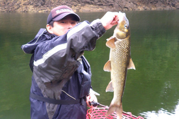その後はhiroさんと上流で合流。先週はクランキングパターンが良かったそうですがこの日はなんだが違うとのことで、途中からライトリグに変更。くろますもライトリグで釣っていくと、25cmくらいのバスが金太郎飴状態でどんどん釣れます。これは確かにパターンですが、サイズが良くないということでhiroさんと下流へ移動。