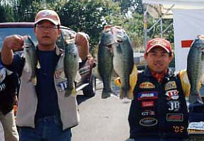 するとポロポロとノンキーの中にキーパーが釣れだし、10時30分すぎにはリミットを達成してしまった。ウエイトは3.5キロくらいか…。ちなみに私はJB2ではバラシが多く、パートナーに迷惑を掛けていたのだが、ここまでノーミス。4本は私、パートナーが1本だ。しかしマリーナの仲間のボートは、あとで50アップを追加し5本で4キロくらいとの話を聞いて、さらに頑張り度が上昇! 入れ替えを何とかしようと釣りに集中!! そして結局2人で計8本のキーパーをキャッチ(やっぱり1本私がバラシましたが…それも50アップを!)。入れ替えをしっかり行って、おそらく4.5キロはいっただろうと帰着へむかった。