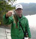 私も釣りたい!と思い必死でキャスト。それっ! キャストキャスト。えいや! キャストキャスト。え〜ん釣れないよ〜。で「あ〜んもう!!」とばかりに思いをのせたワッキーリグの“怒りシェイク”にとうとうバスがバイト。しかし釣れたのは申し訳なさそうな15センチのバス。まるで「これで我慢しとくれ」と言わんばかりじゃないか…。