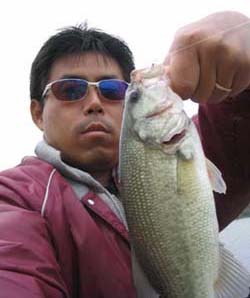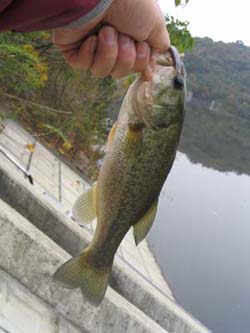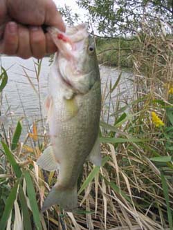 まず最初に行ったのは先週もいったH池。ここは朝からフローターが3名浮いて釣りをしていました。見える範囲内で観察していると、ポツポツ釣れているようです。私もそうこうしている間にカットテールのワッキーにバイト! 20センチくらいでしたが、まずは一匹。先週の“怒りシェイク”は健在です。そしてルアーを変えてTDバイブにもバイト! 今度はサイズアップして30センチのバス! 30分くらい粘った甲斐があって短時間で2本キャッチ成功(やっぱ粘るといいみたいです。ご褒美???)。ちなみに今回はデジカメの充電池はしっかり充電してきましたので、パシャッとな。