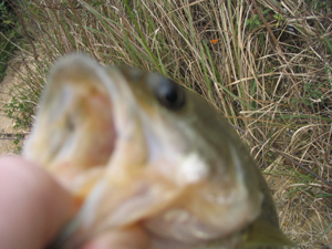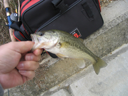 さて、まず始めた池は毎度お馴染みのK池。ここはなんとワンキャスト目でヒット! のっけからナイスサイズの33センチをゲットしました。ワームはスワンプクローラー改を細かくシェイキングしてのヒットでした。ポイント的にはアシ際手前の水中に沈んだパラアシです。「今日は幸先いいな〜」とルンルン気分だたんですけど、この日のK池は濁りがキツく、アタリはあってもバスをキャッチするまではいきませんでした。仕方なく30分ほどで見切って池を変えることにしました。