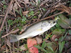 予想できる場所をいくつか点々としながらも、やっぱり厳しいとばかりに、でもあきらめることも出来ずに池を回りました。で、2箇所で釣りをしたんですけど、ようやく3時頃釣れました!今年2本目のバスは27センチでしたが、この季節で知多ならオッケーですよね!ルアーはサスペンドミノーです。ちょっとカバーのある付近に通してみたら釣れました。今年に入ってからバイブレでデッカイの! と思ってやってたんですけど、ちょっと弱気な(?)ルアーを通してみると、たまにはいいこともあるかな?って感じです。でもこのあと、ヒットルアーを岩にぶつけてリップを折っちゃいました(涙)。お店に行ってもなくて、あ〜次はいつ手に入れることができるのやら。