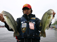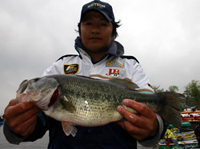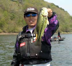 ふう、ようやく着いた場所はわずかにウイードのあるエリアで魚探の反応が出るポイント。ここにアンカーを降ろしてじっくり釣りをすることにしました。すると頑張って漕いだ甲斐あってか、しばらくして黒鱒がライトリグでゲット。このあとも手漕ぎ組が1本ゲット。さらにポイント移動をしてまたまた黒鱒がゲット! そんなこんなでこの日はぼちぼち釣れた(のかな?)と思ったんですけど、あらっ?そういえばパートナーのM氏がまだ1本だけ。ということ残り時間で釣って貰いましょう! て感じでM氏にワンドまで“漕ぎ漕ぎ”して貰って運をためてもらってから釣りを開始しました。すると終了間際、ホントに頑張って漕いだヒトには福ありって感じでパートナーM氏が見事バスをゲットしちゃいました。う〜んこれが今回のキモか。