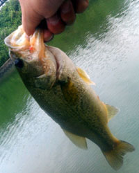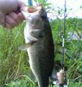 で、コンビニで小休止したあと3つ目の池へ。最近40アップが連発したとの情報ありということでやる気マンマンで釣り開始!! まずは良ちゃんが電話で話しているうちに黒鱒がサクッと小バスをキャッチ。そのあと良ちゃんも同サイズをキャッチ。でなかなかサイズアップしないな〜と思ってたら、黒鱒に流れが向いてきました!サイズはいまひとつの30センチほどですが3本続けてキャッチ成功!! ルアーはすべてカットテールのダウンショットです。バイトはすべてウイードの中です。さすがにこの暑さではバスもシェードから出られませんって感じですね。