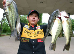 さて話を釣りに戻しましょう!! 河口湖では25日に放流が入ったとの情報は得ていましたので、プラクティスはその放流エリアから始めることにしました。確かに放流エリアにはバスがいます。沢山いますねぇ。はっきり言って簡単に釣れました。ただし朝の早いうちは…です。お昼前に戻ってみるとバスはいるんですけど、全然口を使ってくれません。おいおいどうなってんの?って感じで黒鱒の頭の中はチンプンカンプン。それが暑さなのかプレッシャーなのか、何らかの要因はあるんでしょうけどその対策が得られないまま放流エリアでの釣りは終わってしまいました。