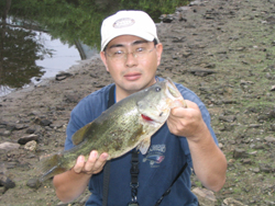 で、キャストを開始して数十分後、黒鱒のロッドにバイトが来ました。でもすっぽヌケっ。そこで黒鱒「おっこれは期待できるかもっ」と私の活性が上がる中、他のアングラーが1本、そして別のところでも1本と釣り上げられていきました。それもY氏が言ったように40アップです。「おお〜、そろそろ黒鱒にもくるかな」さらに期待ムードは高まります。するととうとう黒鱒に待望のバイト!! 今度はしっかりフッキングオッケー!! で〜もですね! なぜが25センチクラスのバスでした。ちょっと期待を裏切られたんでがっくしです。そんなことをしてるうちにY氏が40アップを釣り上げてしまい、黒鱒は刻々と時間が過ぎる中延々とキャストし続けました。