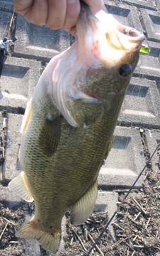 調子に乗るのもいい加減にしろよな〜って感じですが、昨日のラッキーをもう一度!! とばかりに向かいました。今回も最初からストラクチャーのランガンで流しました。するとコンクリート沿いにエスケープツインを通すとコンッとアタリが。でもノリませんでした。バスが小さいのかな?そこでアタリがあったところにテールスライディングシャッドをキャストしたところ一撃でした。スピニングだったのでかなり不安だったんですけど、春ってことでバスもさほど暴れませんでした。無事キャッチしたのは43cmのビッグママ。お腹デップリのナイスバスでした。今日も幸先いいじゃないの!!