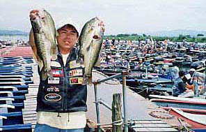 下物の中でも特に狙ったのはエリア的にど真ん中で、さらにメインチャンネルに近い穴、それも急深なブレイクでシェードが形成されそうなところばかりを狙った。プラクティスで反応のよかったダウンショット(ハイブリッドタングステン3.5g+カットテールのワッキースタイル)で攻めるとブレイク一つにつき1フィッシュと言う具合でリズムよく釣れた。しかし5本目をフッキングしたときにブルーギルのような引き方だったので強引に巻いてくるとスレがかりのキッカー! 思いがけないことであわててドラグをゆるめたがすでに時は遅し。フックが外れてしまい、フックの先に残ったのは大きなウロコだった(悲)。残念だがこれも運と思いあきらめながら帰着。しかし2日目は2876gで28位となり、総合は20位に食い込むことができた。