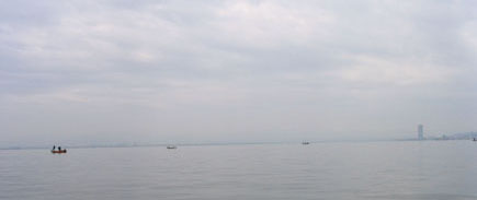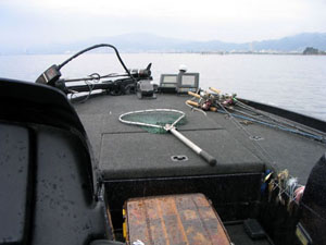 この日(4/28)は朝から雨模様。しかし午後からは急速に晴れてくるとのことで、風が吹く前に釣果を叩きだそうと朝6時過ぎに、現在ガイドの拠点であるアークロイヤルボートクラブから出船。バウを上げ一気に南下し、本日の最初のポイントへ向かった。