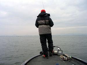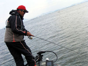 最近の琵琶湖は、例年よりも3週間ほど遅れ気味。狙い方は冬の場所から春の場所へと徐々に以降しているものの、やや冬の場所にガイドのエリアは偏っていた。実際にこれまでに釣れたバスの大半はメスであったという。